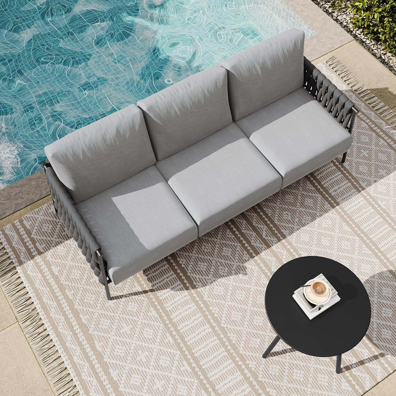 "Product Description:EAST OAK Life Chatter 3-Seater SofaUltimate Comfort & Style: A modern, elegantly designed 3-seater sofa that blends comfort with contemporary aesthetics.Extra-Thick Cushions: Features 6.7-inch high-density foam cushions for long-lasting comfort and support.Easy Cleaning: Removable, washable cushion covers for effortless maintenance.Weather-Resistant: Made with Olefin fabric, TPU coating, and Teslin stitching for enhanced durability against the elements.Heavy-Duty Sturdy Frame: A reinforced steel frame supports up to 1000 lbs for stable and reliable seating.Simple, Hassle-Free Setup: Assembles in about 15 minutes with clear instructions and included hardware.Versatile: Perfect for patios, porches, balconies, or backyards.Specification:3-Seater Sofa Dimensions: 32.28 x 80.31 x 24.80 inchesWeight Capacity: 1000 lbsProduct Care & TipsThe back cushion is vacuum-sealed for shipping and may take time to fully expand after unpacking. To help it regain its shape faster, gently pat it a few times, then place it in direct sunlight for a few hours.Colors may look slightly different depending on lighting and surroundings. If you have any questions or need a cushion replacement, feel free to reach out to our customer service team."