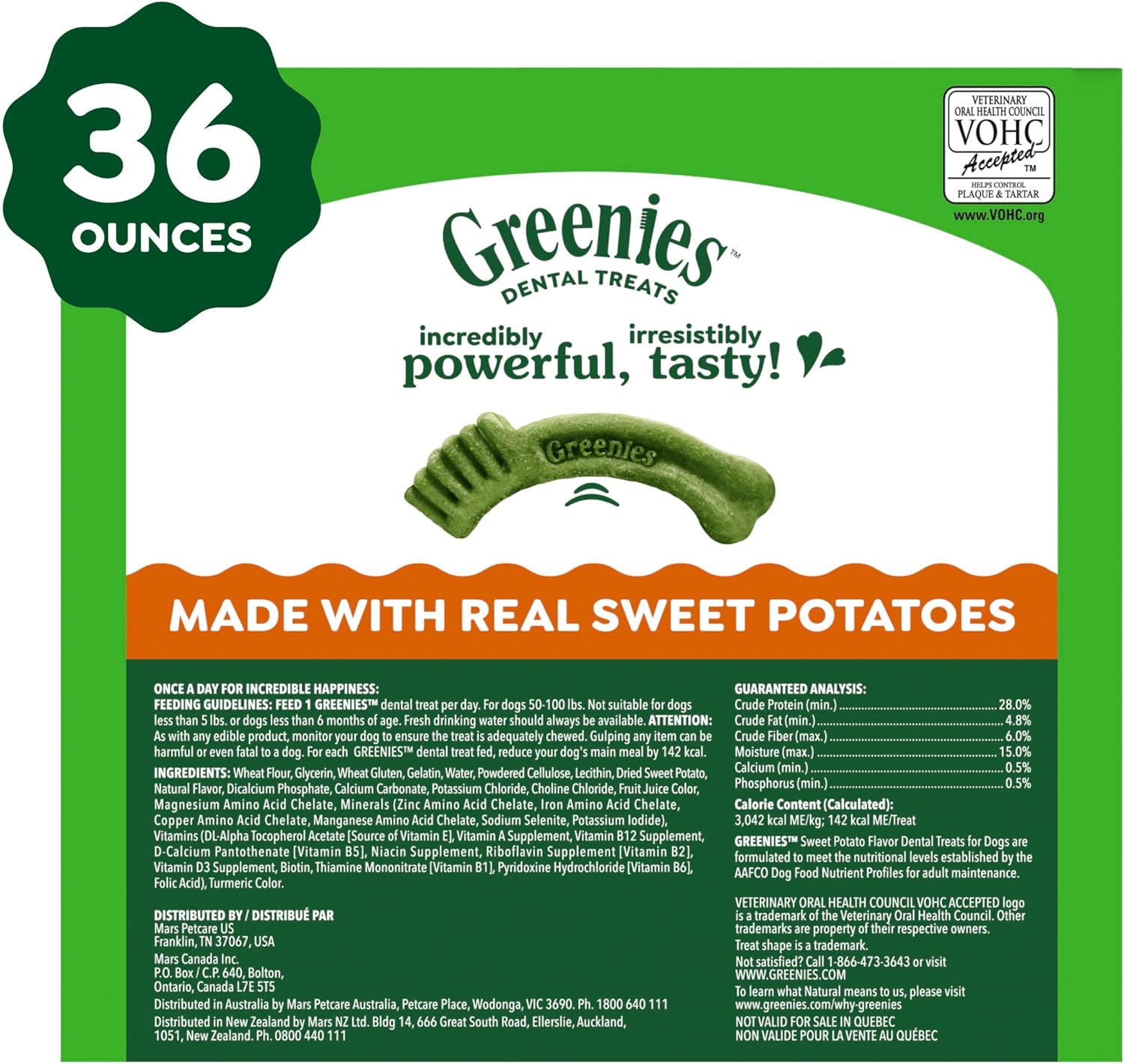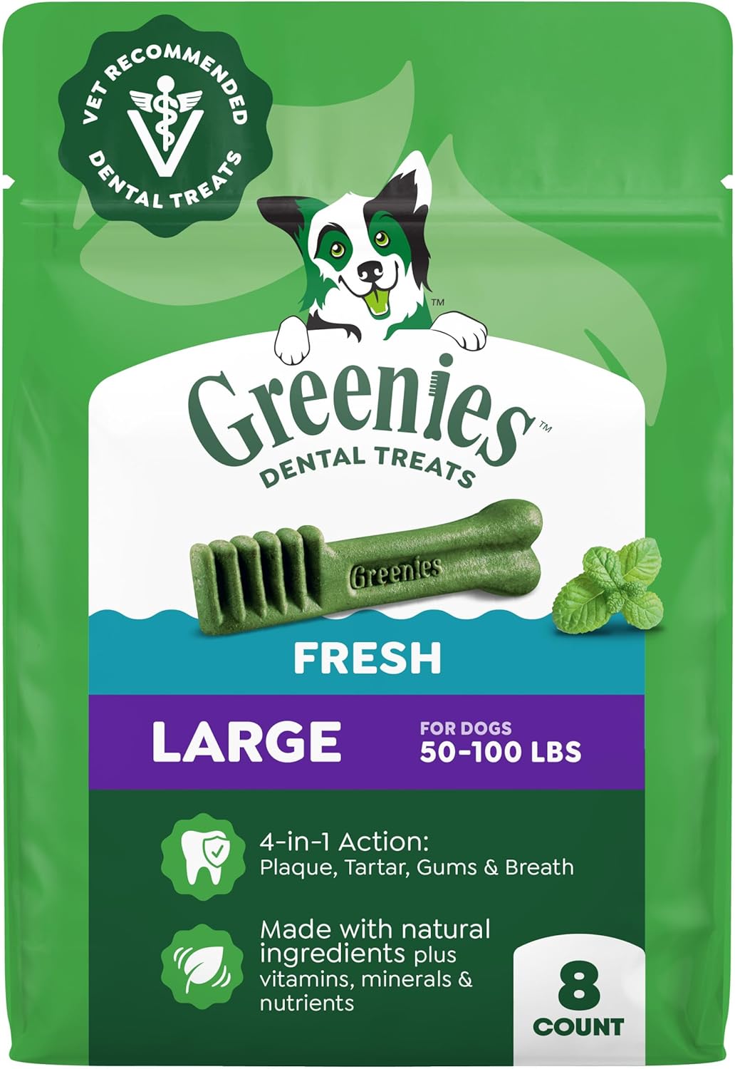 80% of dogs develop dental disease by age 3, according to the American Veterinary Medical Association. These Greenies dog treats large size for adult dogs are crafted to support the four areas veterinarians check most: plaque, tartar, gums, and breath. As a dog dental treat, these veterinarian-recommended chewy treats reduce tartar by 47% and plaque by 40% in 28 days (Data on file). Made for pet owners and dog parents who want to give their best friend a chew treat that reduces plaque buildup, provides fresh breath support while supporting oral health maintenance. Your dog can't wait to sink their teeth into these delicious, sweet potato-flavored dog dental sticks that provide tasty reward, fight plaque and tartar while promoting dog health. The design of these dental chews for large dogs works like a toothbrush to clean down to the gumline and support dog dental care as part of a daily routine. Each chew is made with natural ingredients plus vitamins, minerals, and nutrients. Made for dogs between 50-100 lb., Greenies dental chews for dogs are rawhide-free, easy to chew and digest, and bendable--won't snap. Your furry friend will love these irresistible, mouth-wowing treats that reduce plaque and tartar, and promote oral health. Make Health A Treat!