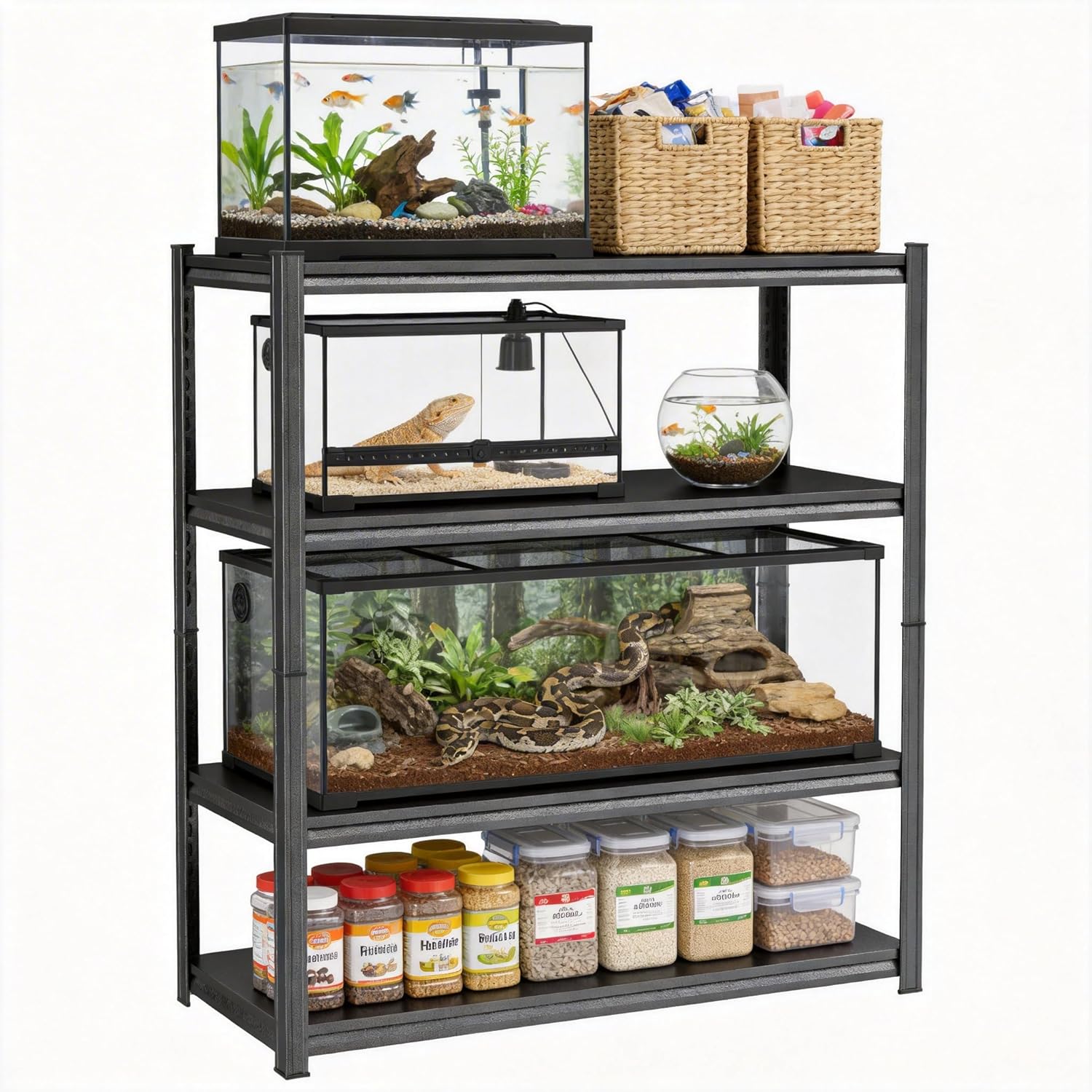 Upgrade your aquarium or reptile setup with this Heavy Duty Metal Stand. Built with a reinforced all-metal frame and rust-resistant powder coating, each shelf supports up to 500 lbs, making it perfect for large aquariums, fish tanks, or reptile terrariums. Its durable, low-maintenance design resists scratches, water, and rust, ensuring long-lasting use even in wet or humid environments. With adjustable shelf heights, this stand fits small, medium, and large tanks, optimizing space while keeping your habitat organized and accessible. The multi-tier storage provides extra room for aquarium accessories, tools, decorations, and supplies, helping you maintain a clutter-free setup. Assembly is quick and easy thanks to the snap-together design—no extra tools required. All hardware and detailed instructions are included, allowing you to enjoy a stable, functional, and stylish aquarium stand in minutes. Perfect for hobbyists and professionals alike, this stand combines strength, versatility, and convenience for any aquatic or reptile habitat.