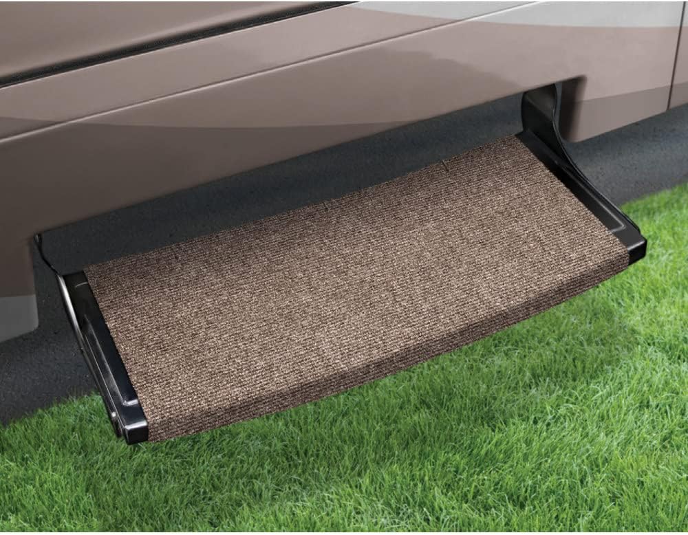 Outrigger Radius XT Step Rugs provide a better fit and carpet covers more of the step. Specifically designed to fit curved RV steps. These step rugs feature a micro-ribbed texture to provide better traction. Easy to install with included springs and hook-and-loop fastening strips fitting manual and electric steps 8 inches to 10 inches deep. Made of olefin carpet that is UV-protected against sun damage and fading and resistant to mold and mildew. Easy to clean, simply hose off and dry. 22 inches wide. Made in the USA.