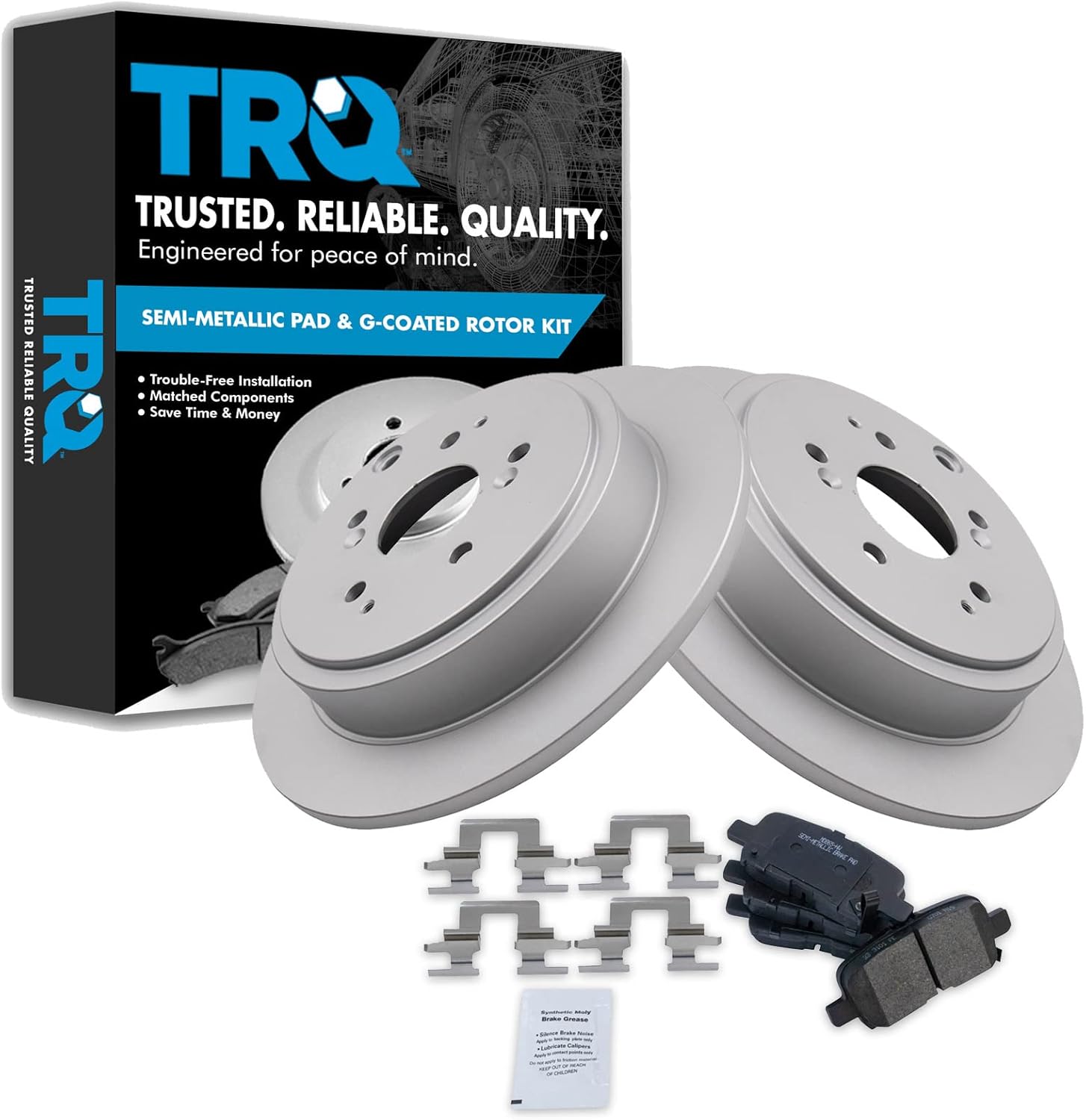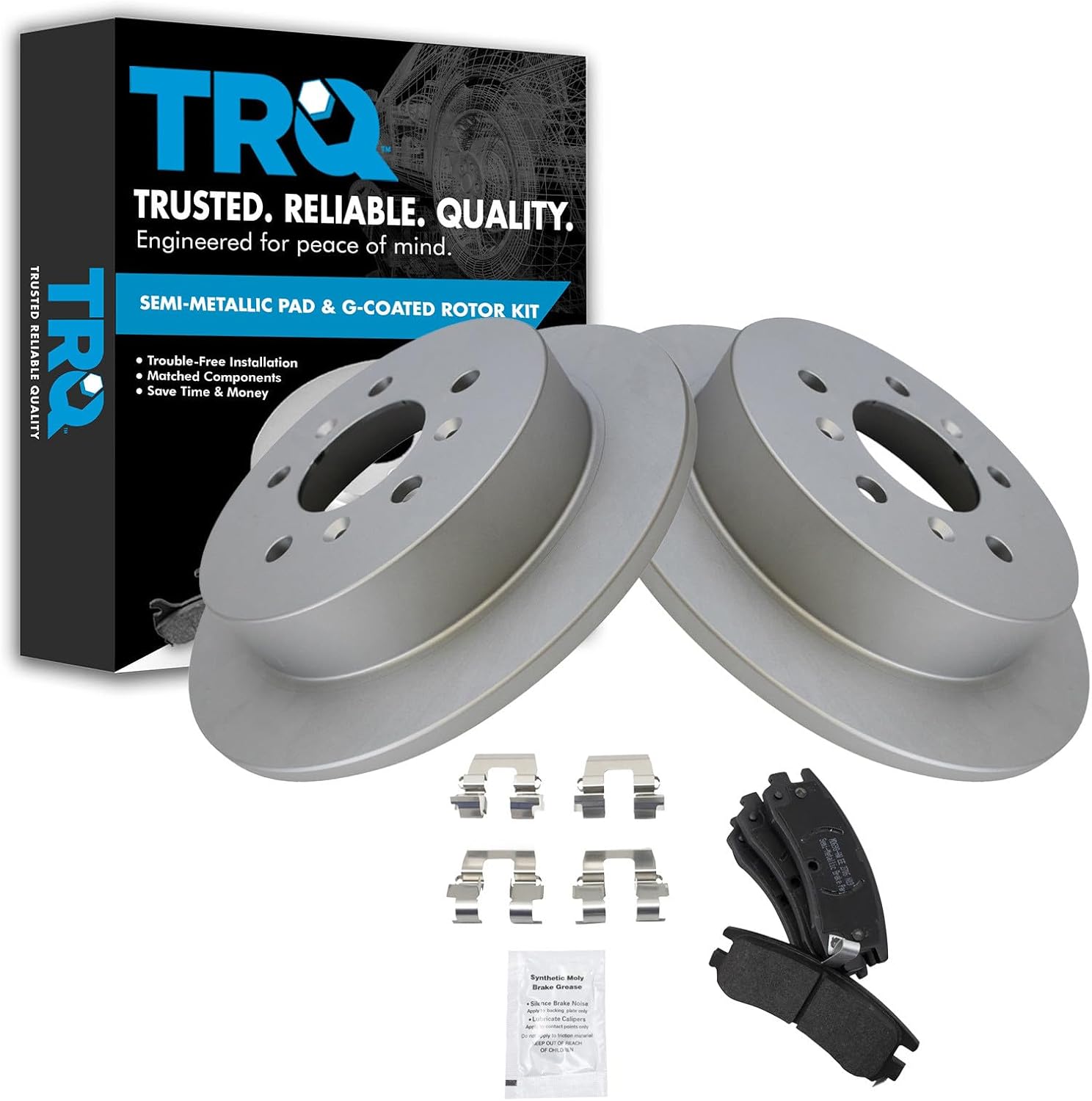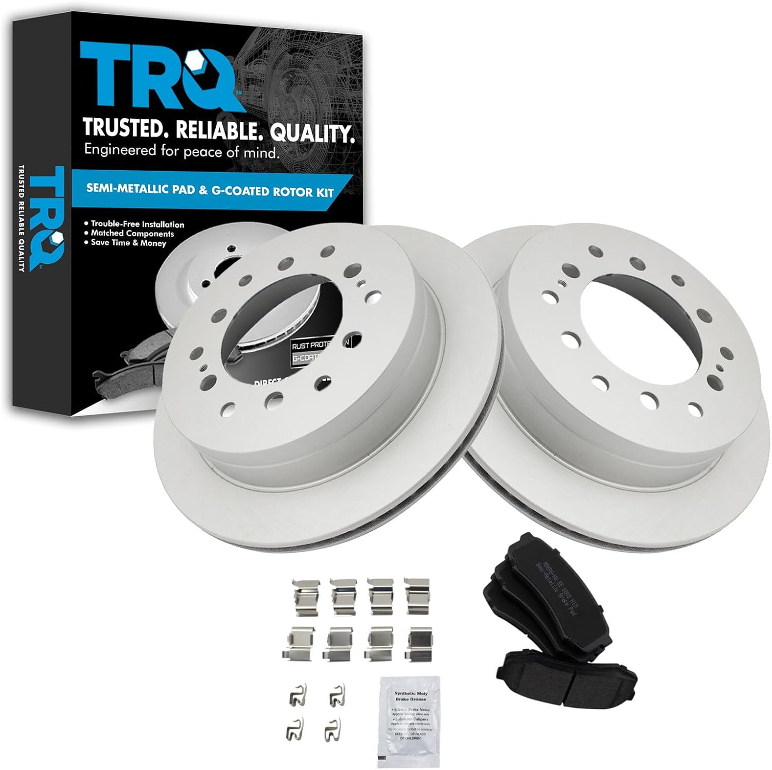 Semi-Metallic Brake Pad & Rotor KitKit Includes(1) Rear Semi-Metallic Brake Pad Set(2) Rear Premium G-Coated Brake Rotors12.99 in. (330mm) Brake Rotor DiameterFitmentCadillac Escalade 2002 - Rear Wheel Drive Rear with Center Anti-Rattle Clip 2002-06 - All Wheel Drive RearCadillac Escalade ESV 2003-06 - RearCadillac Escalade EXT 2002-06 - RearChevrolet Avalanche 1500 2002 - Rear Wheel Drive Rear with Center Anti-Rattle Clip 2002-06 - 4 Wheel Drive RearChevrolet Silverado 1500 2003-06 - Rear with Dual Piston Rear CalipersChevrolet Suburban 1500 2000-01 - with Limited Slip Rear Axle Rear with 330mm Diameter Rear Rotors with Dual Piston Rear Calipers 2002 - Rear Wheel Drive Rear with Center Anti-Rattle Clip 2002-06 - 4 Wheel Drive RearChevrolet Tahoe 2000-01 - Rear with 330mm Diameter Rear Rotors with Dual Piston Rear Calipers 2002 - Rear Wheel Drive Rear with Center Anti-Rattle Clip 2002-06 - 4 Wheel Drive RearGMC Sierra 1500 2001 - Rear with 330mm Diameter Rear Rotors with Dual Piston Rear Calipers 2002 - Rear with Dual Piston Rear Calipers 2003 - V8 5.3L Rear with 330mm Diameter Rear Rotors with Dual Piston Rear Calipers 2004-06 - Rear with Dual Piston Rear CalipersGMC Yukon 2000-01 - Rear with 330mm Diameter Rear Rotors with Dual Piston Rear Calipers 2002 - Rear Wheel Drive Rear with Center Anti-Rattle Clip 2002-06 - 4 Wheel Drive RearGMC Yukon XL 1500 2000-01 - Rear with 330mm Diameter Rear Rotors with Dual Piston Rear Calipers 2002-06 - All Wheel Drive Rear 2003-06 - 4 Wheel Drive RearProduct AttributesFriction Material Composition: Semi-metallicBrake Rotor Diameter: 12.99 in. (330mm)Wheel Lug Count: 6 LugBrake Rotor Coating: Premium G-CoatedBrake Pad Bonding Type: Premium PosiBrake Pad Friction Material: Semi-MetallicBrake Rotor Venting Type: VentedProduct Features Positive Molded: Less dust resulting in clean wheels Electrostatic Coated: Long-lasting rust protection G3000 Casting Alloy: Reduced noise and improved wear resistance Application Specific Design: Extended service life, no modificationsItem DetailsTRQ brake kits are designed to restore your brake system to like-new performance. TRQ brake pads are positive molded, thermal scorched, chamfered, and utilize a multi-layer shim for enhanced performance and service life. TRQ G-coated rotors have long-lasting rust prevention, perfect for wheels with large openings that expose the rotor and rotor hat during daily drives. All products are fit and road-tested in our Massachusetts R&D facility to ensure we deliver on our promise of Trusted Reliable Quality.Reference Numbers1804420255067EHT834H