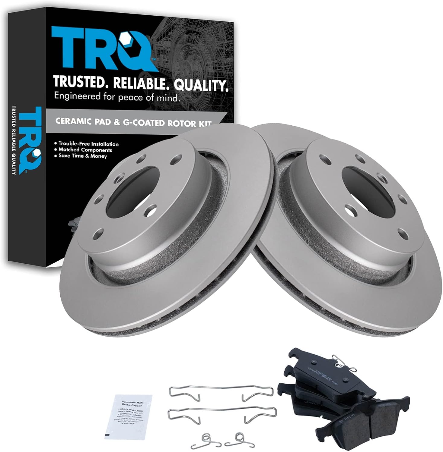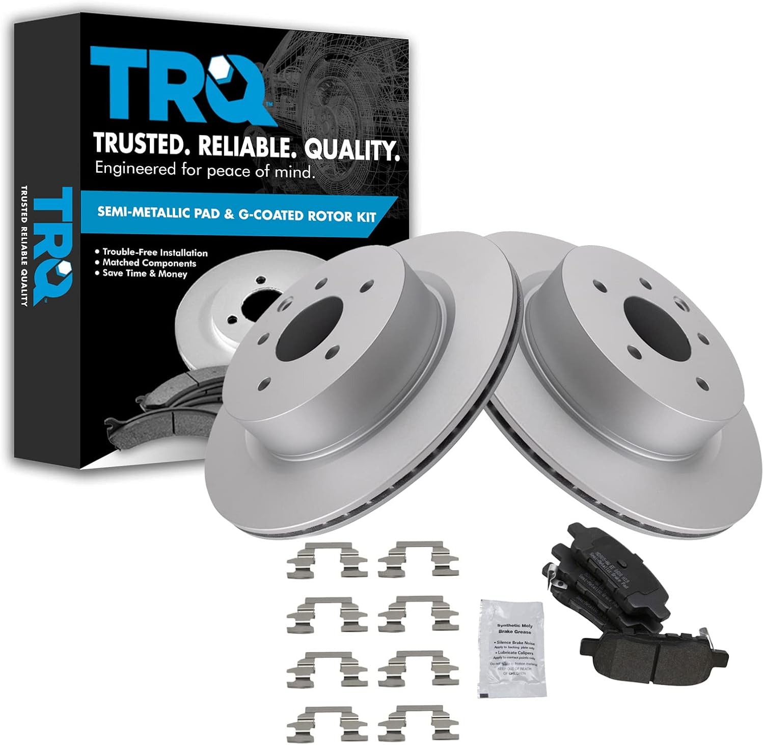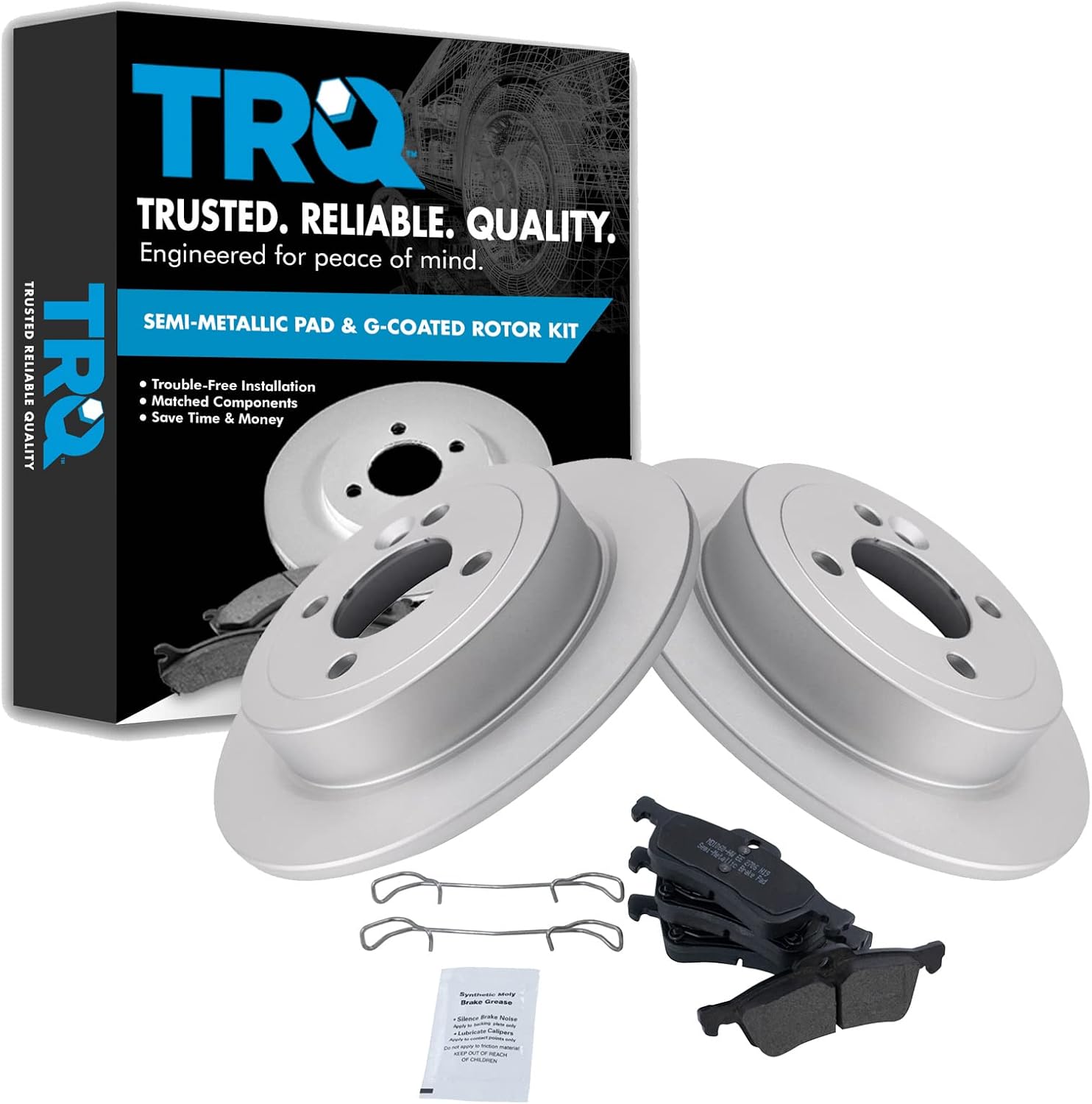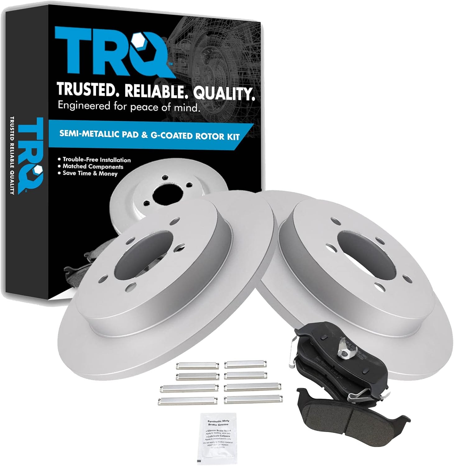 Semi-Metallic Brake Pad & Rotor KitKit Includes(1) Rear Semi-Metallic Brake Pad Set(2) Rear Premium G-Coated Brake Rotors12.99 in. (330mm) Brake Rotor DiameterFitmentCadillac Escalade 2002 - Rear Wheel Drive Rear with Center Anti-Rattle Clip 2002-06 - All Wheel Drive RearCadillac Escalade ESV 2003-06 - RearCadillac Escalade EXT 2002-06 - RearChevrolet Avalanche 1500 2002 - Rear Wheel Drive Rear with Center Anti-Rattle Clip 2002-06 - 4 Wheel Drive RearChevrolet Silverado 1500 2003-06 - Rear with Dual Piston Rear CalipersChevrolet Suburban 1500 2000-01 - with Limited Slip Rear Axle Rear with 330mm Diameter Rear Rotors with Dual Piston Rear Calipers 2002 - Rear Wheel Drive Rear with Center Anti-Rattle Clip 2002-06 - 4 Wheel Drive RearChevrolet Tahoe 2000-01 - Rear with 330mm Diameter Rear Rotors with Dual Piston Rear Calipers 2002 - Rear Wheel Drive Rear with Center Anti-Rattle Clip 2002-06 - 4 Wheel Drive RearGMC Sierra 1500 2001 - Rear with 330mm Diameter Rear Rotors with Dual Piston Rear Calipers 2002 - Rear with Dual Piston Rear Calipers 2003 - V8 5.3L Rear with 330mm Diameter Rear Rotors with Dual Piston Rear Calipers 2004-06 - Rear with Dual Piston Rear CalipersGMC Yukon 2000-01 - Rear with 330mm Diameter Rear Rotors with Dual Piston Rear Calipers 2002 - Rear Wheel Drive Rear with Center Anti-Rattle Clip 2002-06 - 4 Wheel Drive RearGMC Yukon XL 1500 2000-01 - Rear with 330mm Diameter Rear Rotors with Dual Piston Rear Calipers 2002-06 - All Wheel Drive Rear 2003-06 - 4 Wheel Drive RearProduct AttributesFriction Material Composition: Semi-metallicBrake Rotor Diameter: 12.99 in. (330mm)Wheel Lug Count: 6 LugBrake Rotor Coating: Premium G-CoatedBrake Pad Bonding Type: Premium PosiBrake Pad Friction Material: Semi-MetallicBrake Rotor Venting Type: VentedProduct Features Positive Molded: Less dust resulting in clean wheels Electrostatic Coated: Long-lasting rust protection G3000 Casting Alloy: Reduced noise and improved wear resistance Application Specific Design: Extended service life, no modificationsItem DetailsTRQ brake kits are designed to restore your brake system to like-new performance. TRQ brake pads are positive molded, thermal scorched, chamfered, and utilize a multi-layer shim for enhanced performance and service life. TRQ G-coated rotors have long-lasting rust prevention, perfect for wheels with large openings that expose the rotor and rotor hat during daily drives. All products are fit and road-tested in our Massachusetts R&D facility to ensure we deliver on our promise of Trusted Reliable Quality.Reference Numbers1804420255067EHT834H